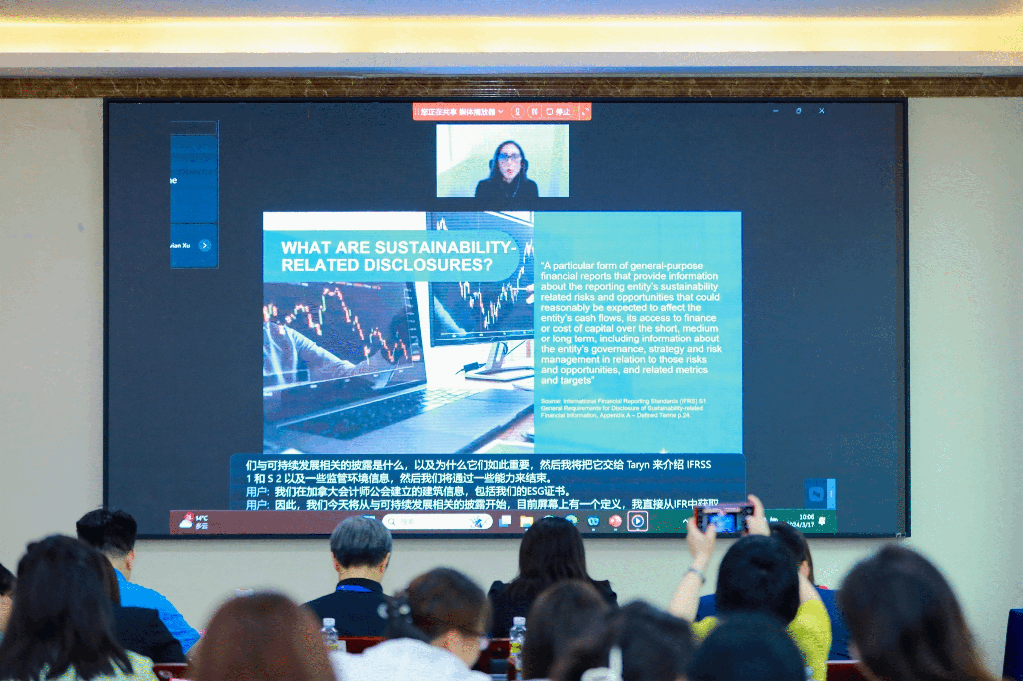 加拿大特许专业会计师协会研发总监Taryn Abate(线上)主要就“可持续性相关披露的定义与重要性”“披露过程中存在的风险和机遇的类型”和“国际可持续发展准则理事会(ISSB)标准:包括IFRS S1和S2”进行了重点分享,为与会者提供了关于可持续性报告的深入见解。
