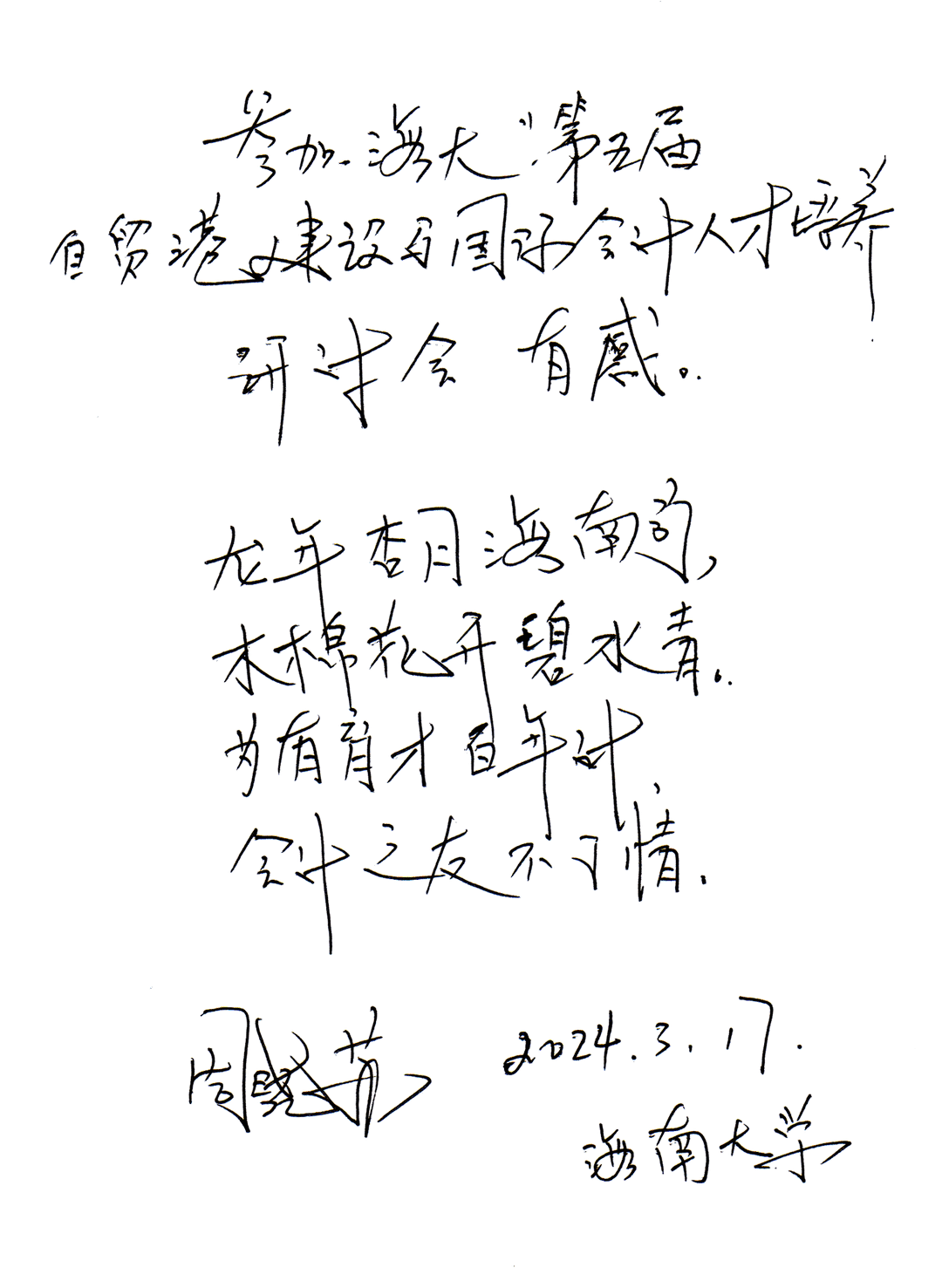 “道器并举,商济天下”这是公海gh555000aa线路检测的院训,同时亦是本次研究会与会专家针对ESG及其人才培养方面的共同理念。本次研讨会探讨了ESG治理、可持续性报告、科技创新与财务管理融合、国际化会计人才培养等关键议题。与会专家形成共识,表示在未来,无论是学术界还是实务界,会计领域都将更加注重可持续发展报告与国际化会计人才培养,以适应全球化发展趋势。大会以习近平新时代中国特色社会主义思想为指导,就自贸港建设与国际会计人才培养展开深入研讨,必将积极推进生态文明建设和绿色低碳发展。有感于会议的顺利召开,南开大学周晓苏教授即兴赋诗一首“龙年杏月海南行,木棉花开碧水青;为国育才百年计,会计之友不了情。”