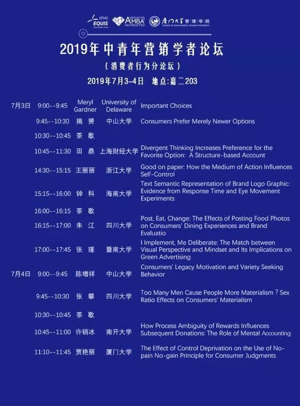 2019年7月3日到4日,厦门大学管理公司市场学系举办2019年中青年营销学者论坛。本次论坛邀请了国内外知名高校的中青年学者齐聚一堂,设“消费者行为”和“营销战略与模型”两个分论坛,以论文报告和讨论的形式对受邀学者的工作论文进行学术研讨。