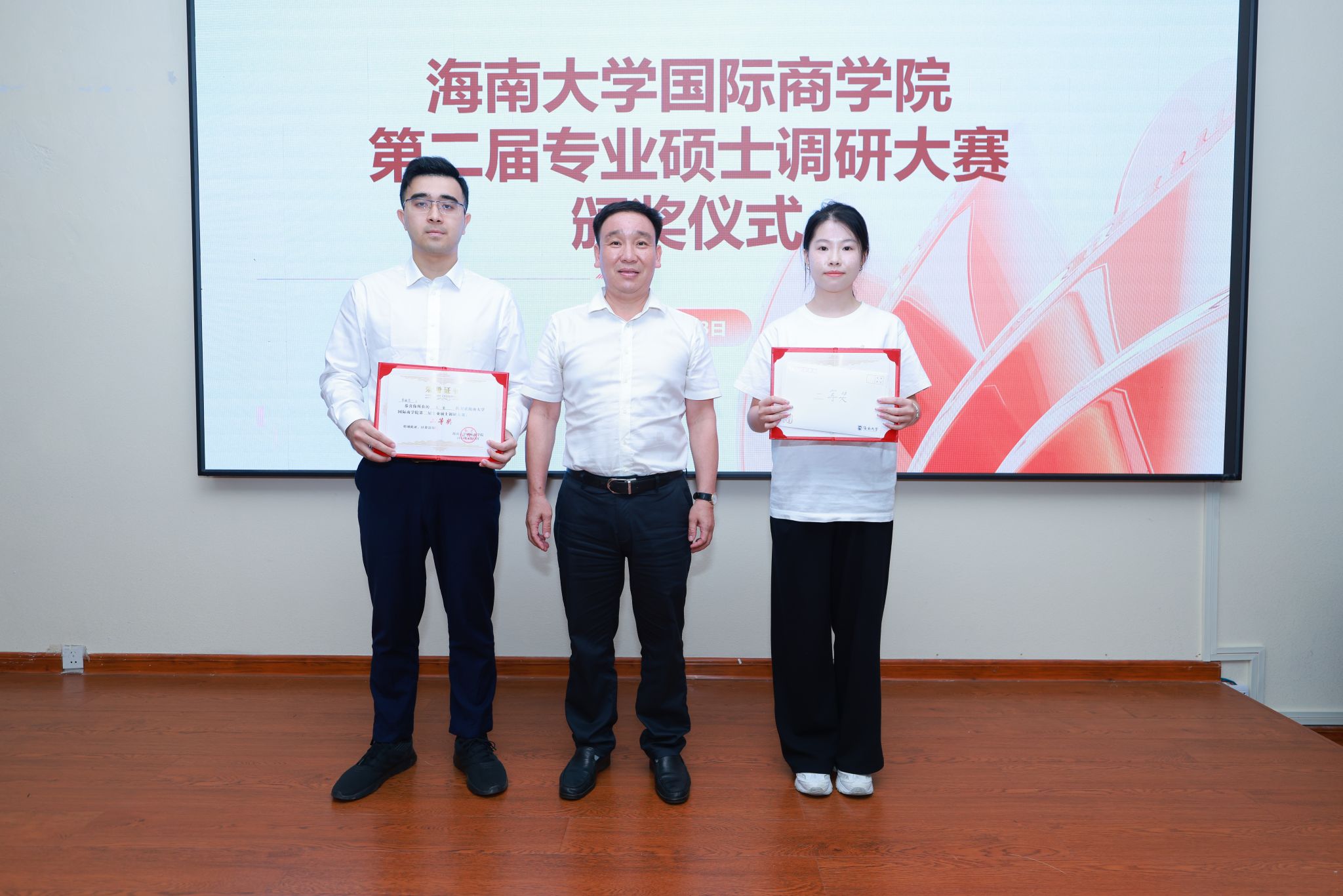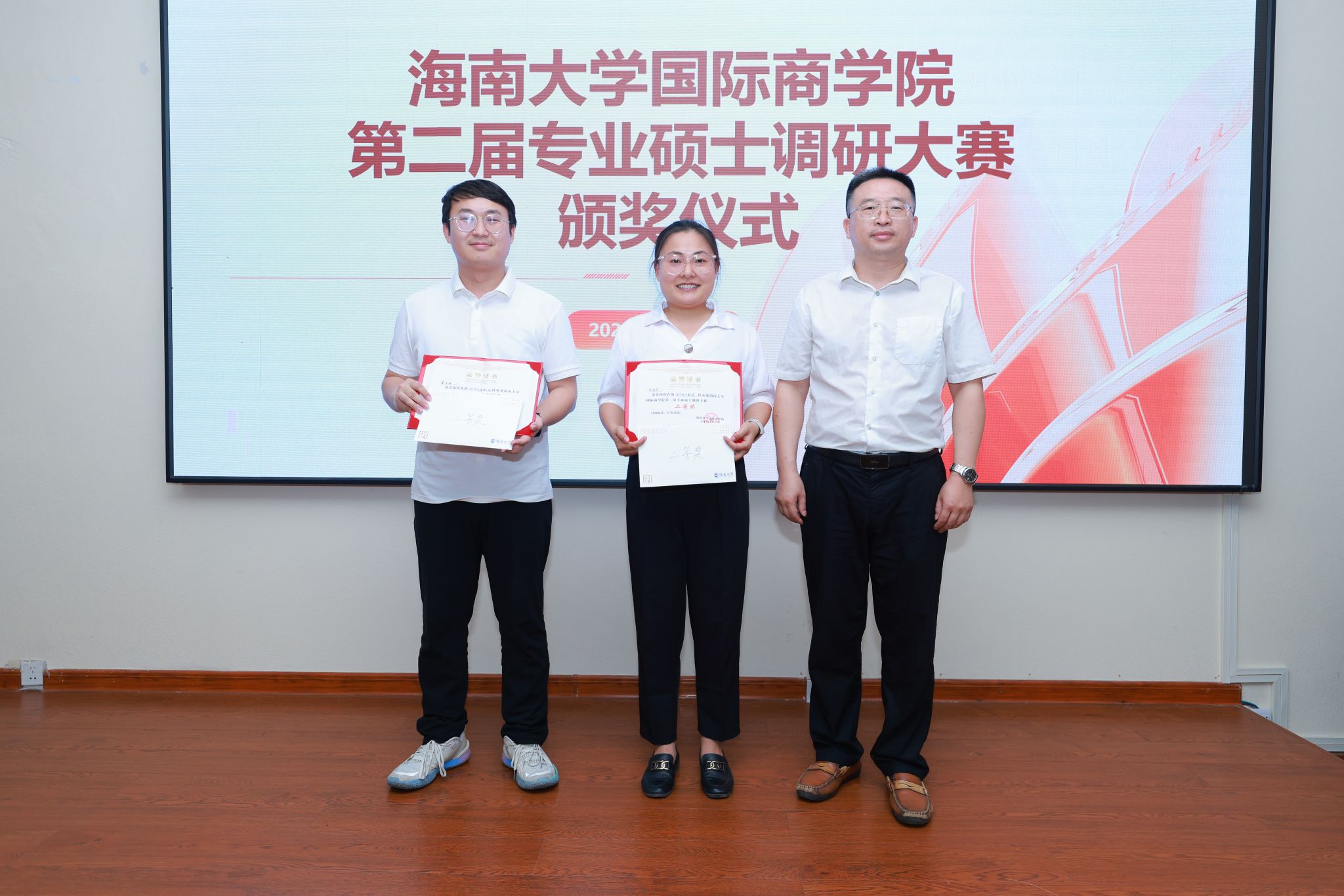 荣获一等奖的四个团队分别为:森秘研究所(MBA)、南海六粒粟(农业硕士)、四小龙取经队(农业硕士)、自贸港冲冲冲(会计专硕)。经理唐宁玉和党委负责人共同为获得一等奖的参赛队伍颁奖。