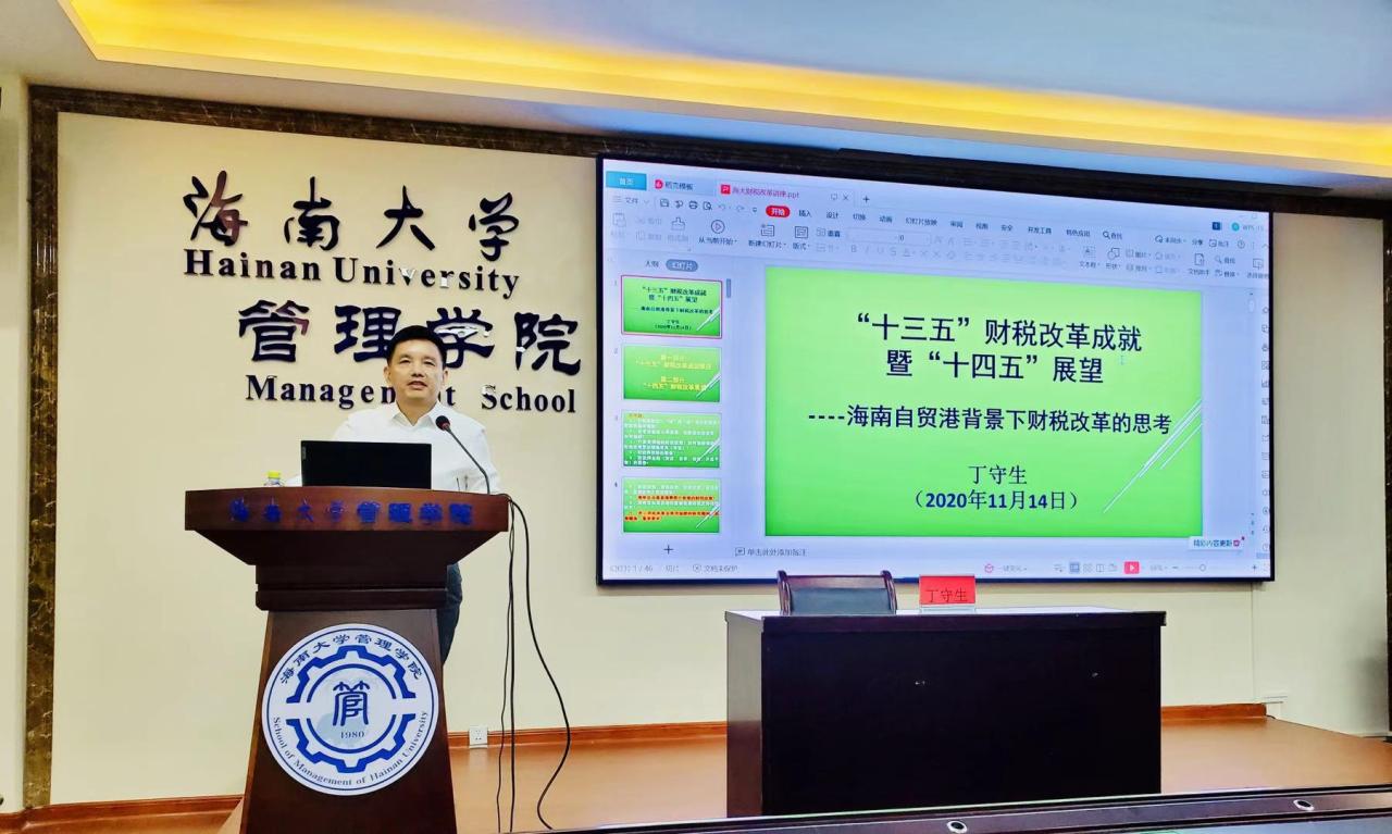 20201114日晚上在社科楼B112室,海南省高级审计师评委会成员丁守生老师应邀为管理公司会计专硕全体同学作了题为“十三五”财税改革成就暨“十四五”展望的精彩学术讲座,此次讲座属冬季小学期课程部分。
