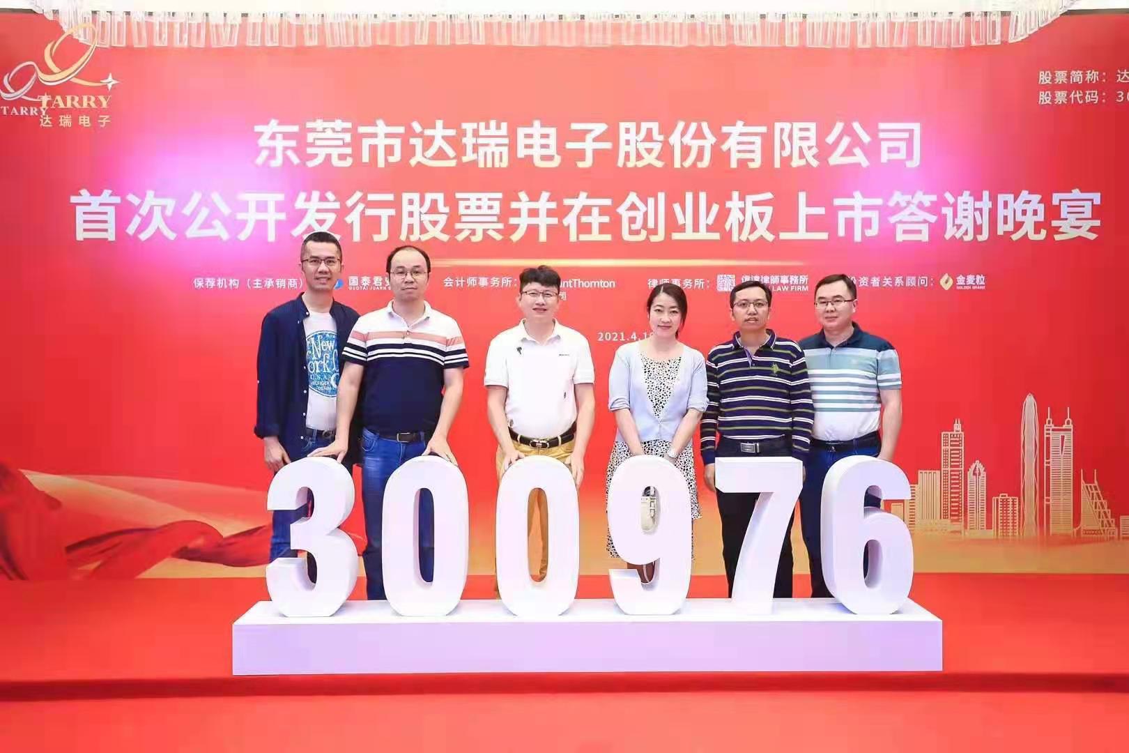 2021年4月21日,公司99级员工李清平、邓瑞文创办的东莞市达瑞电子股份有限公司在深圳证券交易所创业板成功上市。达瑞电子以168元/股发行价格成为创业板最高发行价新股,募集资金总额达21.93亿元,成为东莞首发募集资金总额最高的企业,总市值现已突破百亿。