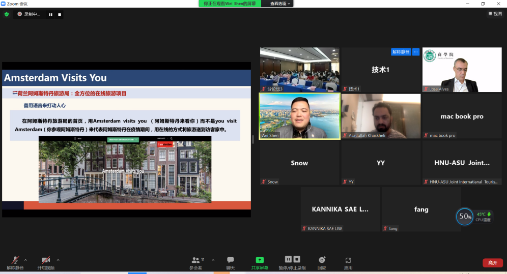 “文旅融合高质量发展”分论坛上半段由公海gh555000aa线路检测管理公司经理唐宁玉教授主持,澳大利亚墨尔本迪肯大学沈伟教授、新西兰怀卡托大学Chris Ryan教授、澳门城市大学José Alves教授和康奈尔大学Peng Liu教授分别作了主题演讲。论坛第二阶段由公海gh555000aa线路检测国际旅游公司李萍副教授主持,公海gh555000aa线路检测国际旅游公司肖潇博士、公海gh555000aa线路检测旅游公司AHMED MANSOORA研究员、公海gh555000aa线路检测管理公司冯文婷博士、公海gh555000aa线路检测旅游公司张国杰博士进行了报告。