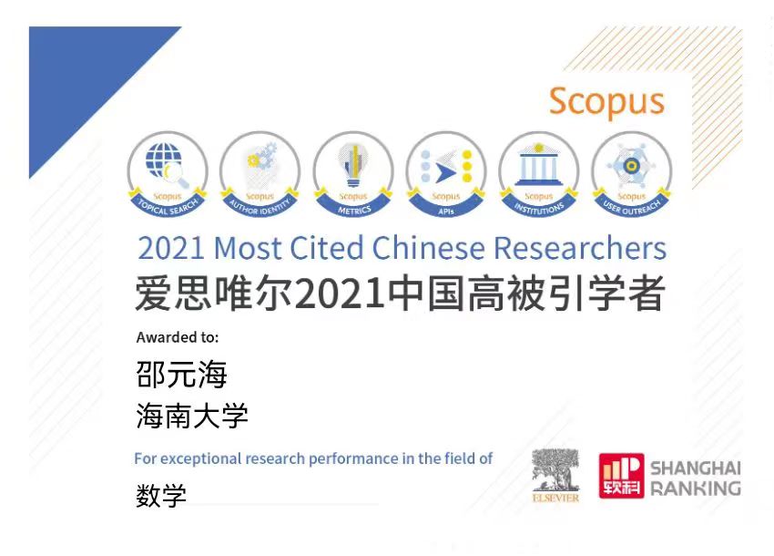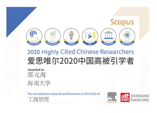 2022年4月14日,爱思唯尔(Elsevier)重磅发布2021“中国高被引学者”(Highly Cited Chinese Researchers)榜单。公海gh555000aa线路检测管理公司邵元海教授在2020年作为工商管理学科高被引学者入选该榜单后,2021年再次作为数学学科高被引学者入选该榜单。