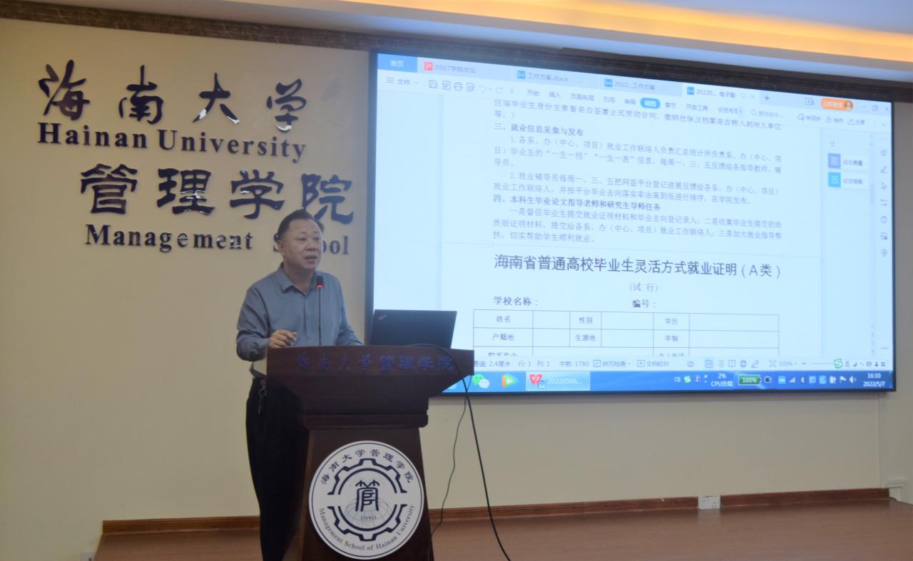 2022年5月7日下午,管理公司在社科楼B112学术报告厅召开师德师风“四评”工作暨毕业生就业工作会议。管理公司经理唐宁玉、党委书记邢谷川、副经理张德生、副经理付景涛以及天工书公司党委副书记主持工作易振出席会议。各教工党支部书记、各系、办(中心/项目)主任及就业工作联系人参加会议。