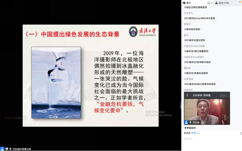 范如国教授围绕着“绿色发展:理论与实践逻辑“的主题从绿色发展理念,绿色发展的含义,绿色发展进程,能源、生产和消费革命,绿色发展中的经济和管理科学问题,以绿色发展引领产业绿色转型,实现绿色发展的路径等六个方面进行了深入浅出的讲解,并结合复杂性理论对我国绿色发展的学术研究和实践方向提出了独到见解。