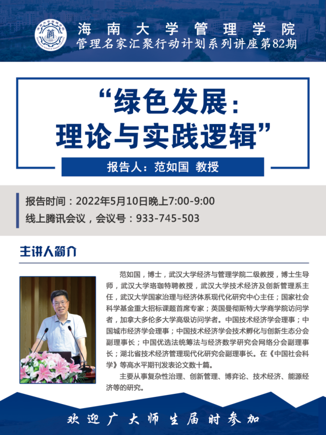 2022年5月10日,公海gh555000aa线路检测管理公司管理名家汇聚行动计划系列讲座第82期顺利举办(线上视频会议形式)。本次讲座由武汉大学二级教授、武汉大学珞珈特聘教授、经济与管理公司博士生导师范如国教授主讲,公海gh555000aa线路检测管理公司副经理付景涛教授主持。公海gh555000aa线路检测管理公司和经济公司教师及工商管理硕士研究生(MBA)等近200人在线参加了本次讲座。