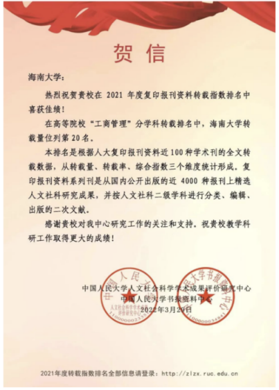 2022年3月29日,中国人民大学人文社会科学成果评价研究中心和中国人民大学书报资料联合发布了2021年度复印报刊转载指数排名。公海gh555000aa线路检测在高等院校“工商管理”分学科转载排名中转载量位列第20名。