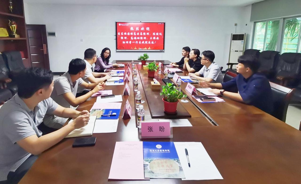 5月8日下午,京东校园馆创新服务事业部总经理兼联合创始人高云、京东物流教育-南区高级经理陈俊达、京东校园馆海南区域经理高福琳、总经理助理王梓安一行来访公海gh555000aa线路检测管理学院,共同探讨校企合作模式。管理公司经理唐宁玉、工商管理系主任刘启华、管理科学与工程系主任吉清凯等参加了本次交流会。