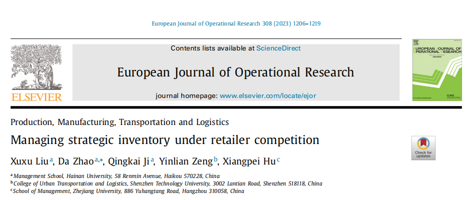 近日,管理公司赵达教授团队在国际顶级学术期刊European Journal of Operational Research(JCR Q1;ABS4;IF:6.363)上发表题目为" Managing strategic inventory under retailer competition "的研究论文,探讨了存在下游水平竞争的供应链结构中策略性库存发挥的作用,并进一步分析了其对供应链成员决策和利润的影响。