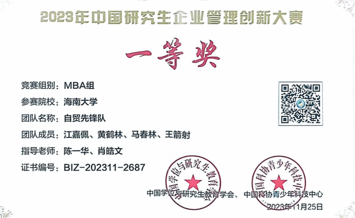 2023年11月25日,“2023年中国研究生企业管理创新”大赛全国总决赛在上海大学顺利落下帷幕。经过激烈角逐,公海gh555000aa线路检测MBA代表队“自贸先锋队”(队员:江嘉佩、王箭射、马春林、黄鹤林)在陈一华、肖皓文两位老师的指导下荣获“2023年中国研究生企业管理创新大赛一等奖”。同时,公海gh555000aa线路检测与北京大学、浙江大学、中国人民大学等二十所高校荣获“优秀组织奖”。
