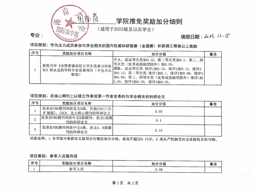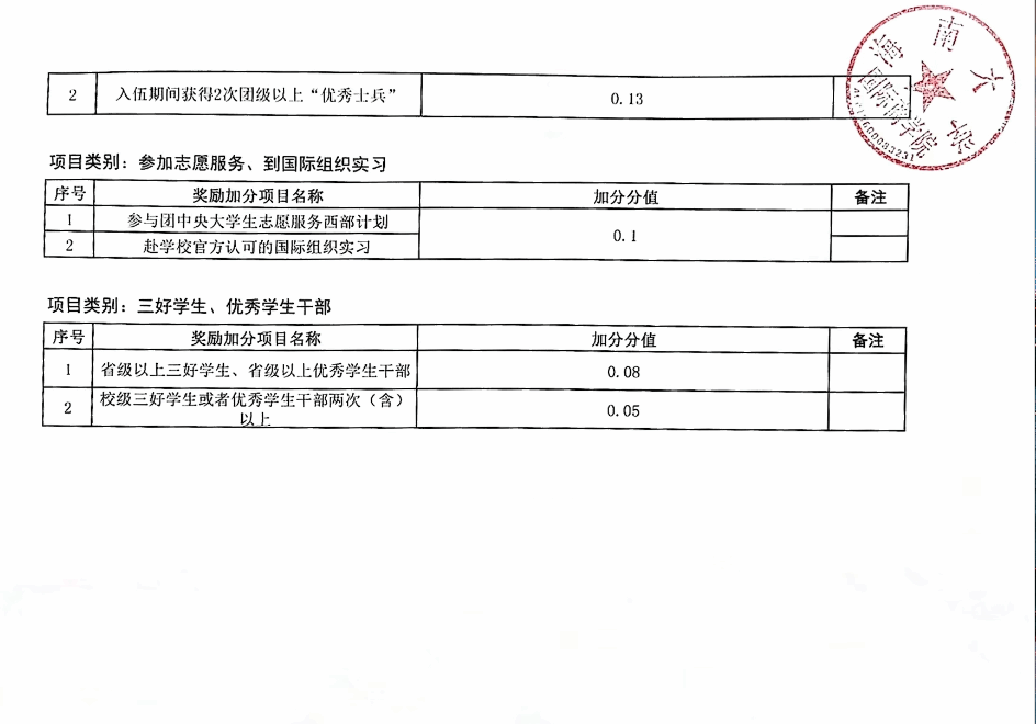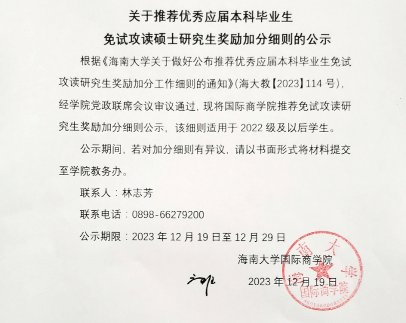 关于推荐优秀应届本科毕业生免试攻读硕士研究生奖励加分细则的公示