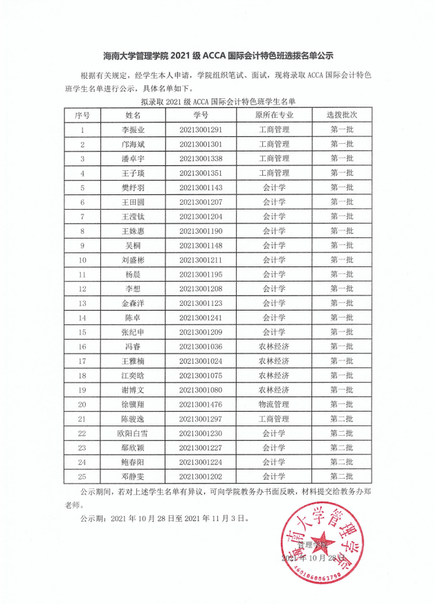 公海gh555000aa线路检测管理公司2021级ACCA国际会计特色班选拔名单公示