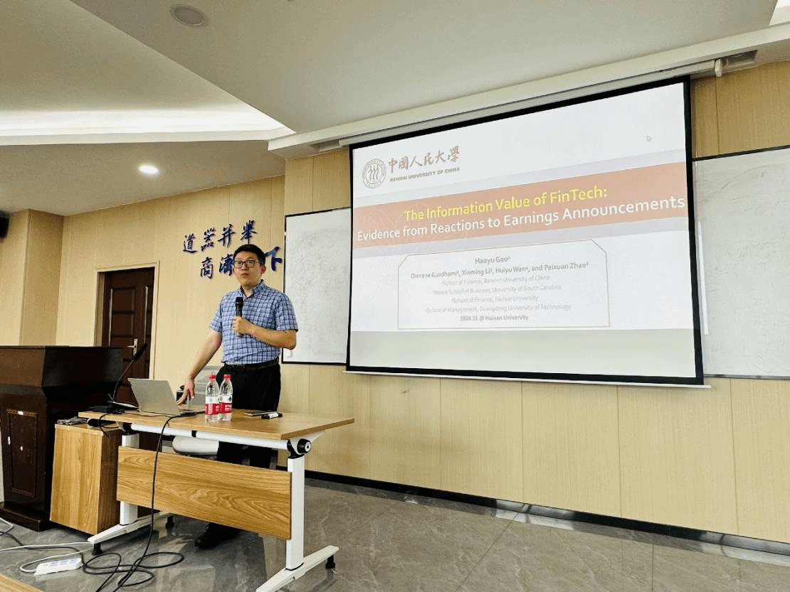 11月5日下午,高昊宇教授在公海gh555000aa线路检测海甸校区社科楼B623室,做了题为“The Information Value of FinTech: Evidence from Reactions to Earnings Announcements”的学术讲座。本次讲座由金融系主任刘志峰教授主持,吸引了金融学专业本科生及相关老师和员工的广泛参与。
