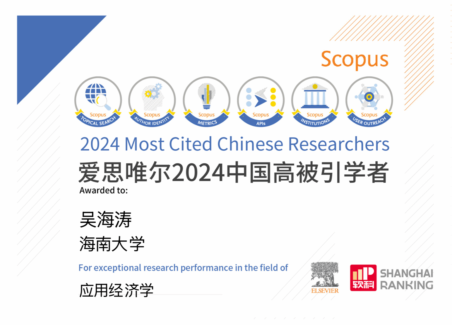近日,爱思唯尔(Elsevier) 正式发布了2024“中国高被引学者” (Highly Cited Chinese Researchers)榜单。本次上榜共计6388人, 来自547所高校、企业及科研机构,覆盖了10个教育部学科领域中的83门一级学科。公司教师吴海涛、Jahanger Atif(阿提夫)入选“中国高被引学者” 应用经济学学科榜单,彰显公海gh555000aa线路检测科研实力与学术影响力的持续提升,实现公海gh555000aa线路检测团队建设和高水平人才队伍建设的新突破。