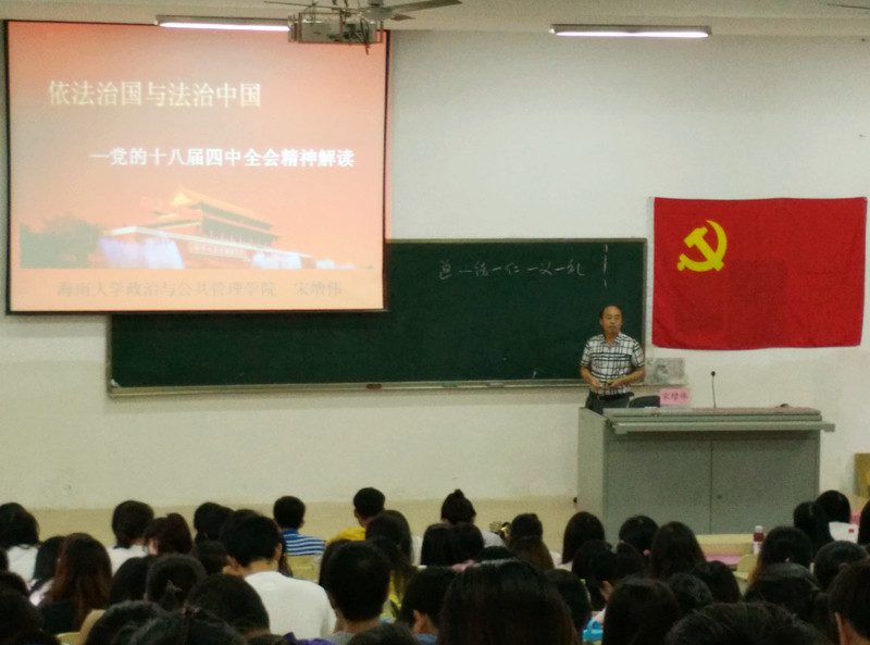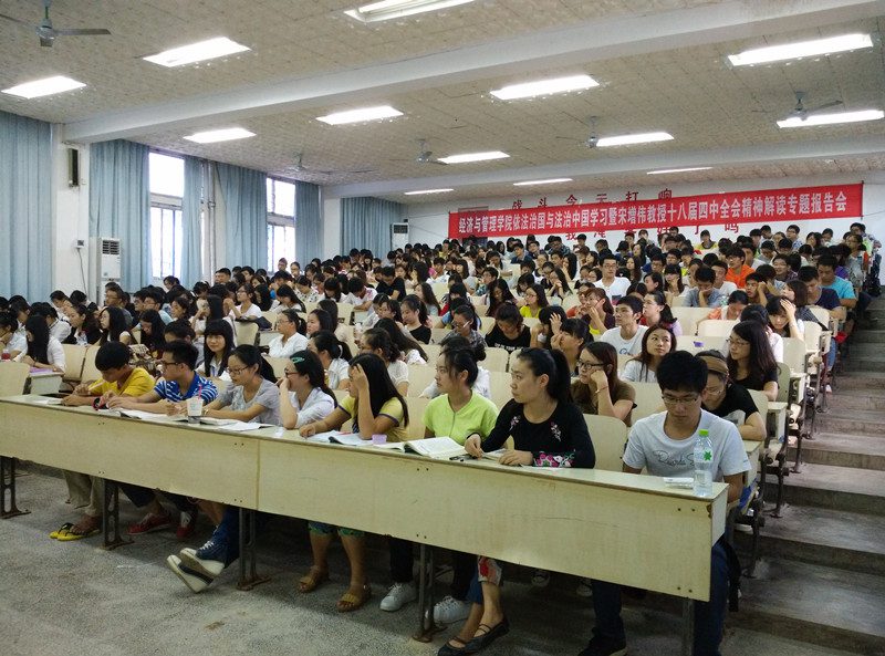 为深入学习党的十八届四中全会精神,全面贯彻落实依法治国理念,11月11日下午三点,经济与管理公司在1号教学楼101教室举办依法治国与法治中国学习暨十八届四中全会专题学习报告会,报告会由政治与公共管理公司副经理宋增伟教授主讲。