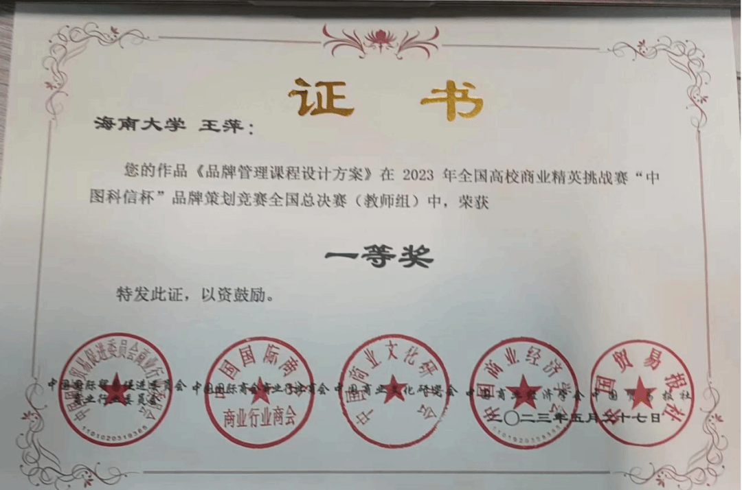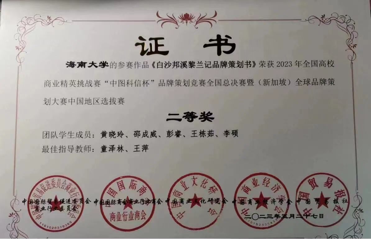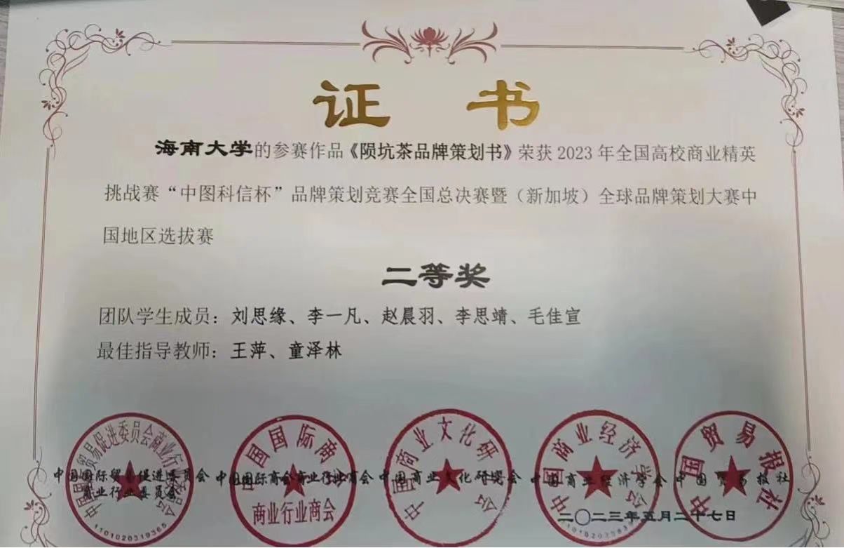 管理公司师生在5月28日闭幕的2023年全国高校商业精英挑战赛“中图科信杯”品牌策划竞赛全国总决赛暨(新加坡)全球品牌策划大赛中荣获佳绩。其中,教师组获全国一等奖,员工组获全国二等奖2项,同时,“海南天然茶叶有限公司”和“白沙邦溪黎佳山兰酒坊”两家企业获得优秀企业奖,“海南天然茶叶有限公司”还获得最具社会责任企业奖,这两家是管理公司在2023年承办的海南省乡村产业振兴带头人培育“头雁”项目的企业,通过比赛,助力品牌,赋能企业,推动了两家企业的品牌影响力,实现了管理公司的产学融合。