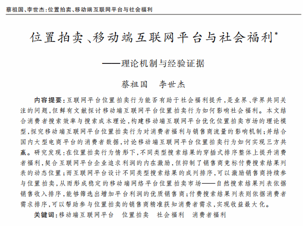 论文聚焦移动端互联网平台位置拍卖行为,通过构建移动端互联网平台优化位置拍卖市场的理论模型,考察位置拍卖行为影响消费者、销售商与互联网平台三方利益一致性的理论机制,探索互联网平台激励销售商参与位置拍卖的策略性行为;并结合产业实践数据进行实证检验,进而解析位置拍卖行为的社会福利效应,从而提出相应的治理措施。