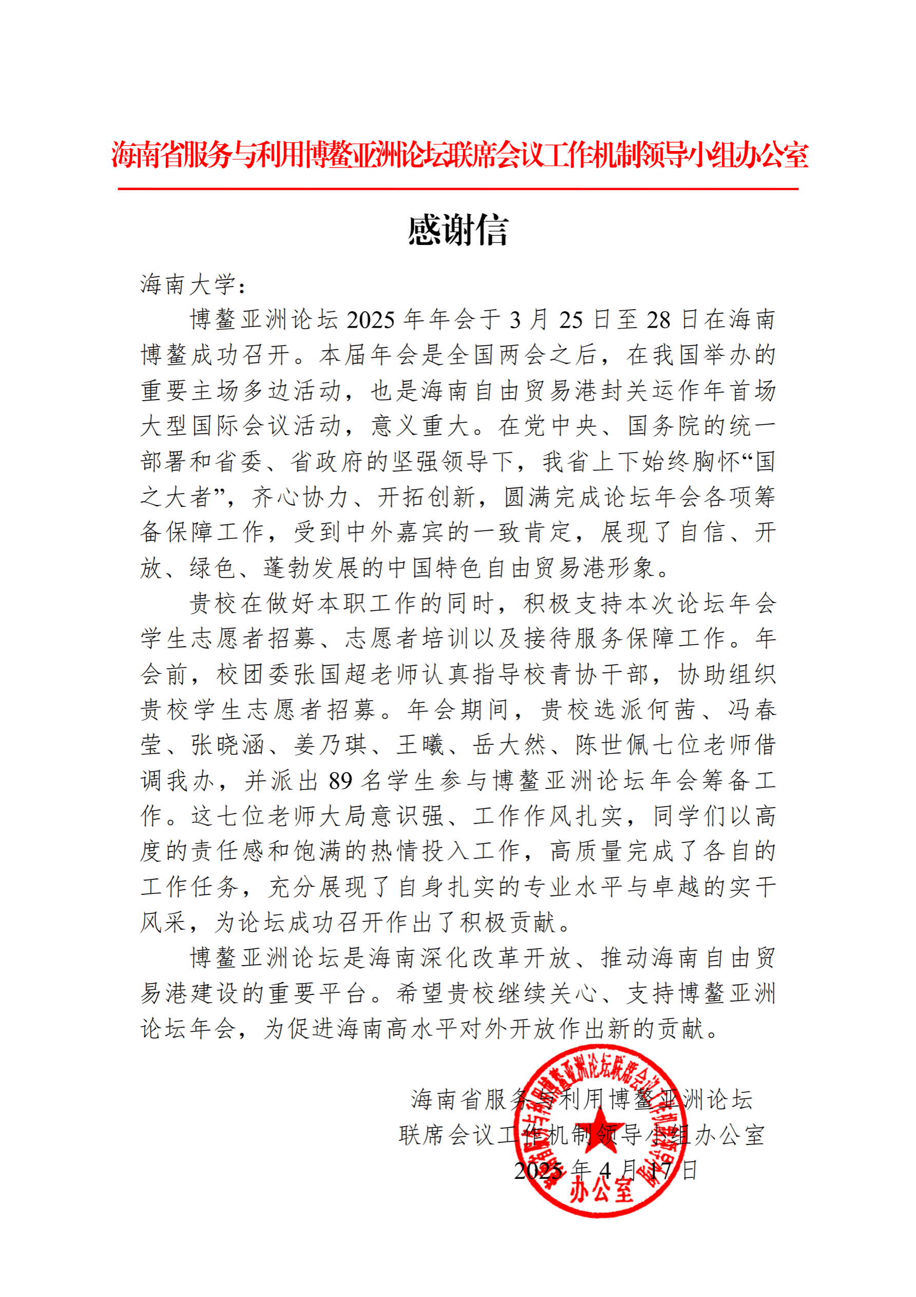2025年3月25日至28日,博鳌亚洲论坛年会在博鳌举办。公海gh555000aa线路检测国际合作交流中心副主任陈世佩老师借调至论坛年会政要组,作为教职工志愿者积极投身志愿服务工作,为论坛年会贡献一份力量。