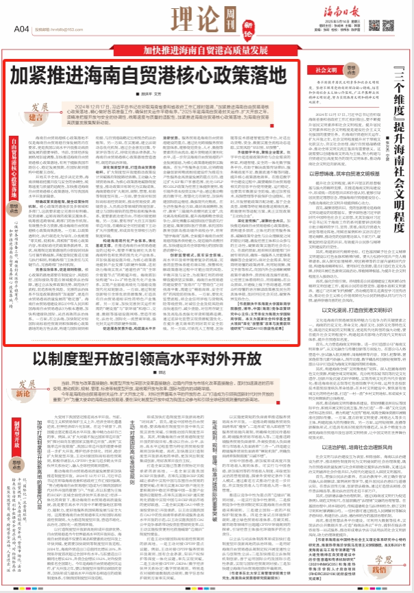 深化制度型开放,打造自由贸易港标杆。扩大制度型开放能推动政策设计突破既有制度路径依赖,主动融入全球贸易体系,为核心政策落地破除制度壁垒,推动政策目标转化为实践成效。海南需稳步扩大规则、规制、管理、标准等制度型开放,一方面,要全面对标国际高标准经贸规则,推动贸易投资、跨境资金、人员流动等领域的制度创新,建立与国际接轨的监管标准和服务体系,使要素流动更自由、市场对接更顺畅。另一方面,要有序扩大自主开放和单边开放,在确保安全可控前提下主动扩大开放维度,形成具有全球吸引力的制度环境。