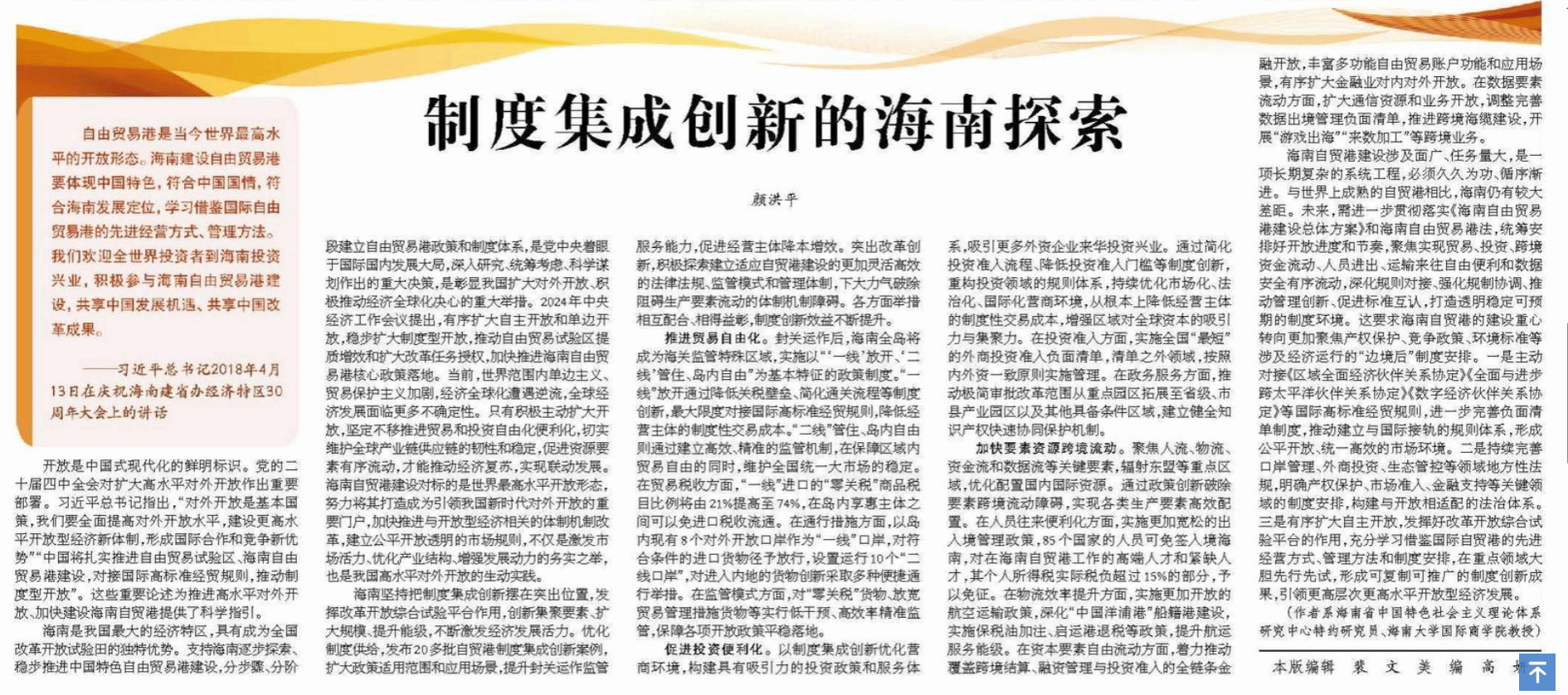 本站讯(通讯员 陈艺靖)2025年10月28日,公海gh555000aa线路检测颜洪平教授的理论文章《制度集成创新的海南探索》在《经济日报》理论版重磅发表。该文立足海南自贸港建设实践,系统阐释制度型开放的“海南路径”,为我国高水平对外开放提供了重要理论参考。