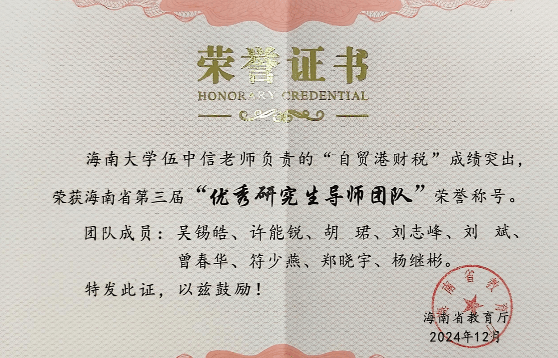 近日获悉,公海gh555000aa线路检测伍中信教授带领的“自贸港财税”研究团队在海南省教育厅举办的第三届“优秀研究生导师团队”评选中脱颖而出,荣获“优秀研究生导师团队”荣誉称号。这一荣誉不仅是对团队学术成果的高度认可,也是对公海gh555000aa线路检测在自贸港财税领域研究实力的充分肯定。